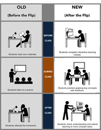 This infographic shows a typical sequence of learning opportunities before, during, and after a flipped class.